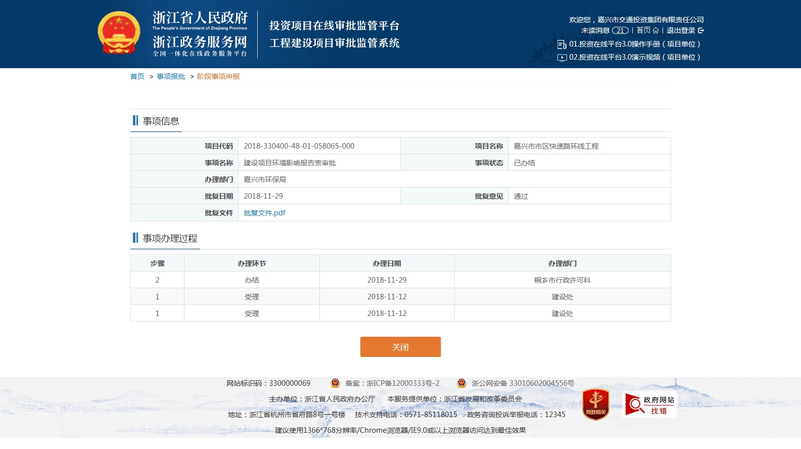 嘉興市市區(qū)快速路環(huán)線工程一期建設(shè)項(xiàng)目環(huán)境影響報(bào)告表審批